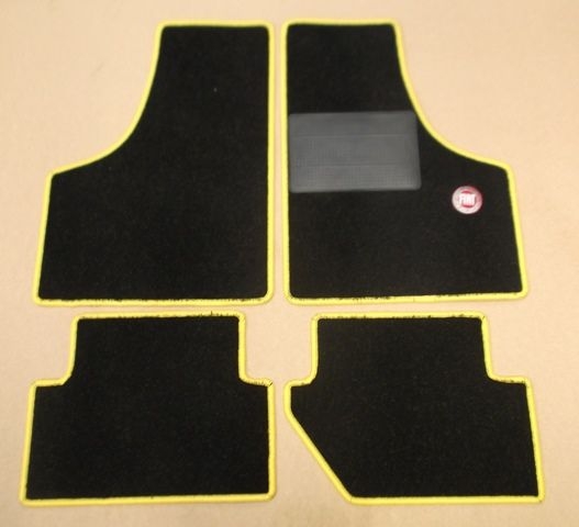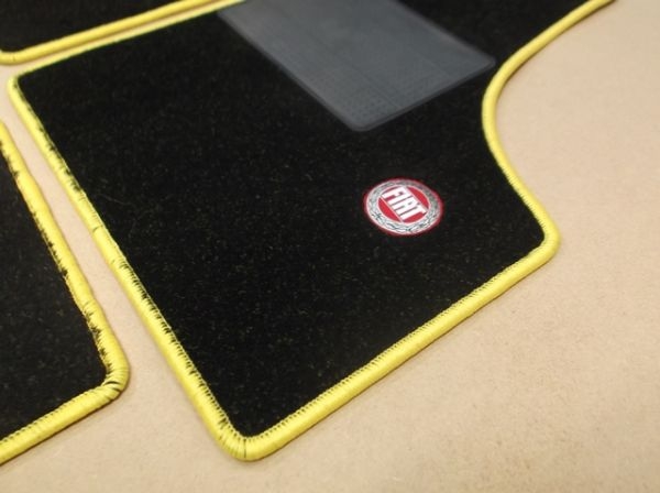RHD Floor mat set in black with yellow edging and 'FIAT' badge on RH mat