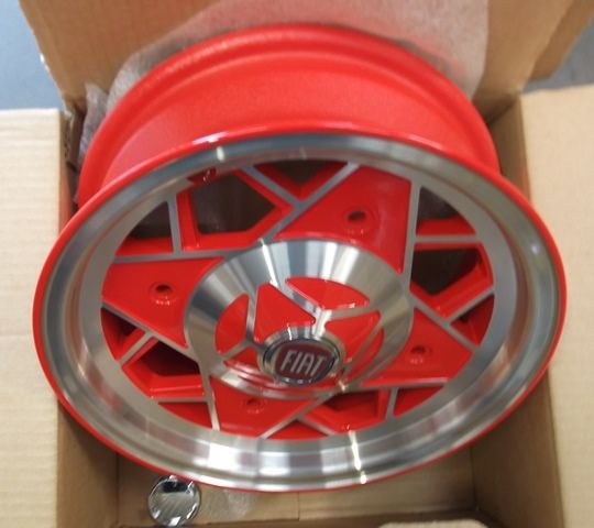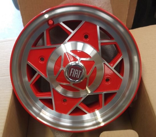 Four spoke Alloy wheel in Red with polished rim, 4.5 x 12 inch rim with STD Fiat 500 PCD