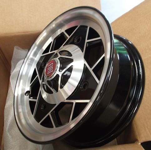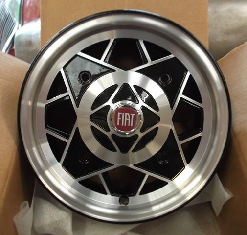 Four spoke Alloy wheel in Black with polished rim, 4.5 x 12 inch rim with STD Fiat 500 PCD