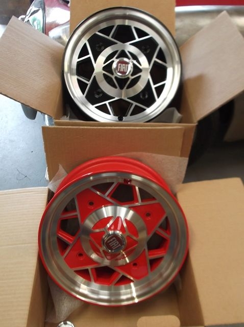 Four spoke Alloy wheel in Red with polished rim, 4.5 x 12 inch rim with STD Fiat 500 PCD